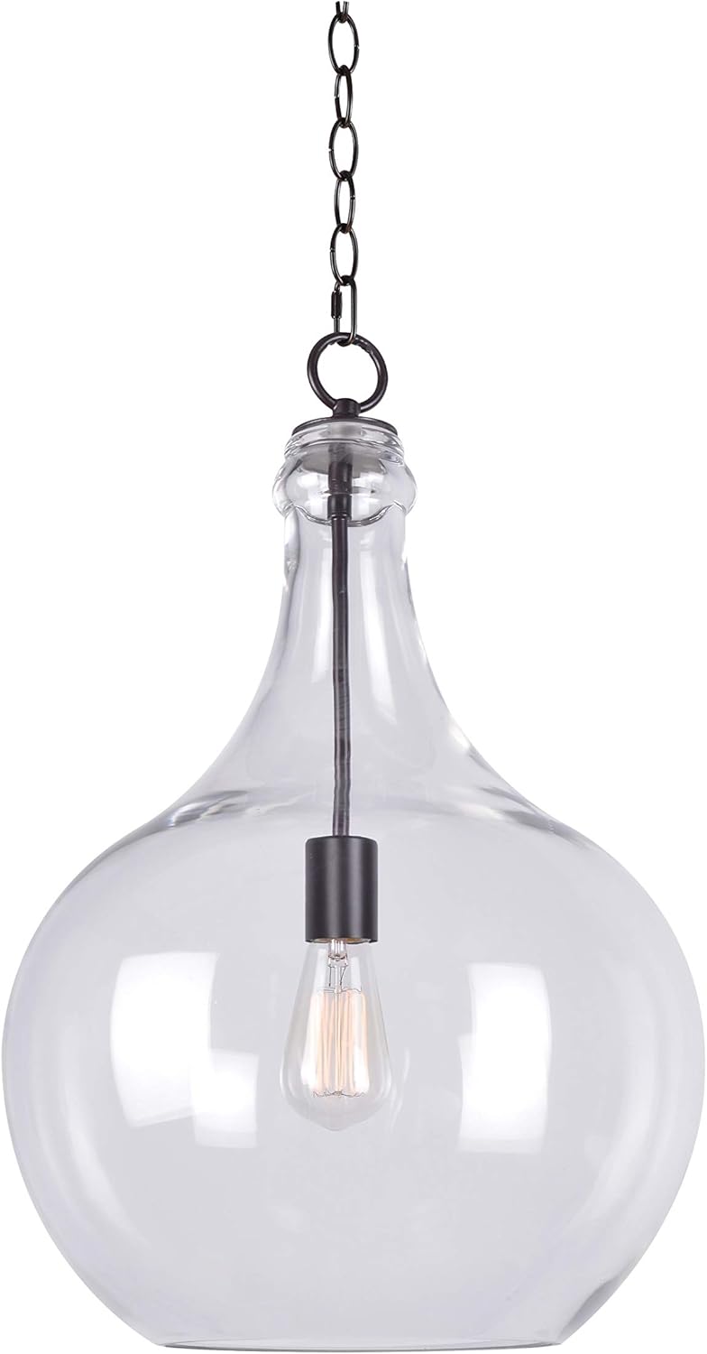 Kenroy Home Modern ceiling light adds a touch of creative flair to your home. Inspired by vintage apothecary glass jugs, this pendant combines vintage and modern in one design. The contrast between an oil rubbed bronze finish with a clear glass shade makes this pendant a stand-out feature in any room. This pendant lighting would be the perfect solution to hang over a cottage-inspired kitchen, contemporary bar height counter, or a small apartment entryway without taking up too much space. With numerous possibilities and places to be hung, the home lighting may just be perfect for your space.