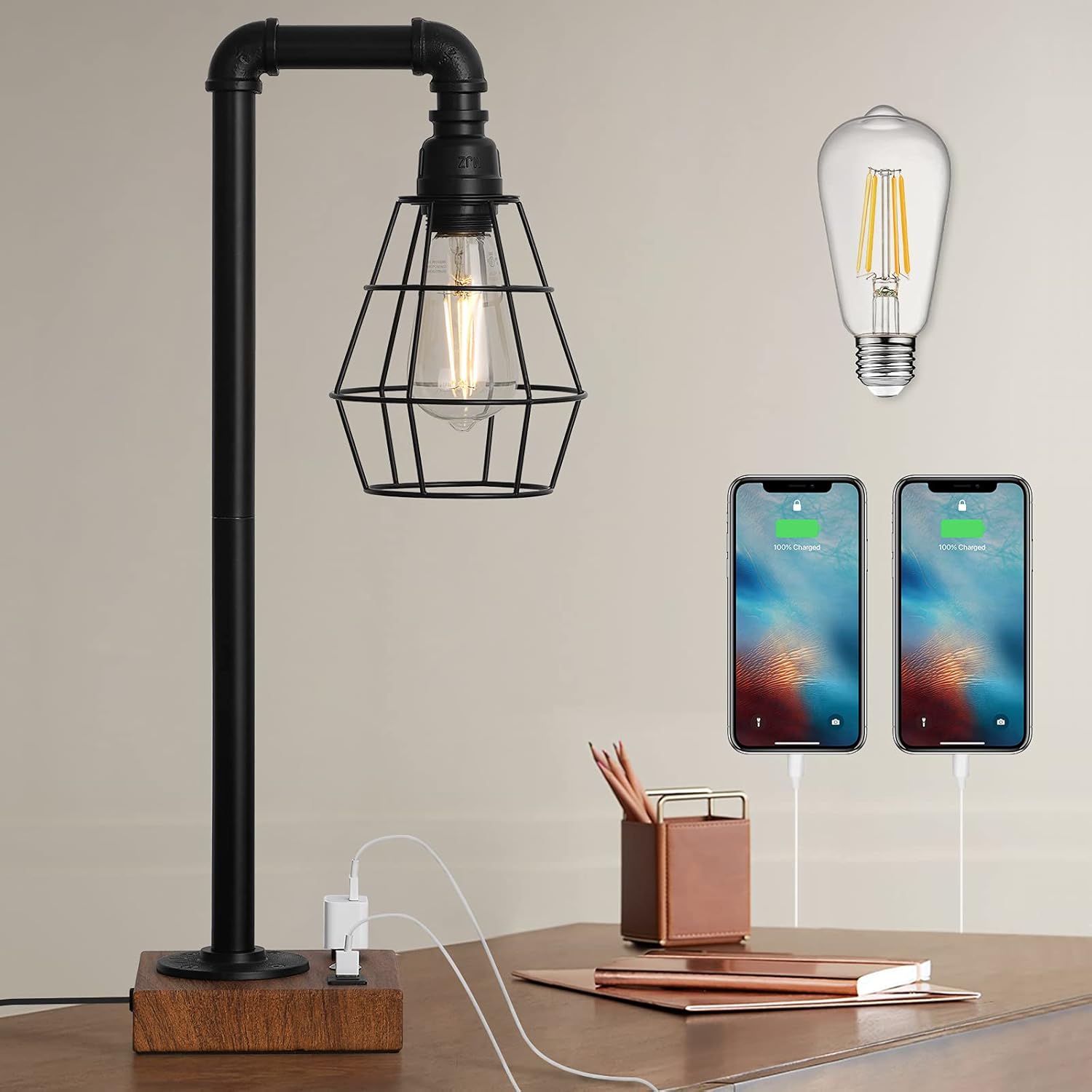 One-Day Sale: Up to 70% Off Table Lamp Industrial Desk Lamp with Dual USB 3-Way Touch Control Dimmable Edison Nightstand Bedside Lamp with AC Outlet and Black Metal Cage for Bedroom Living Room (Bulb Included)